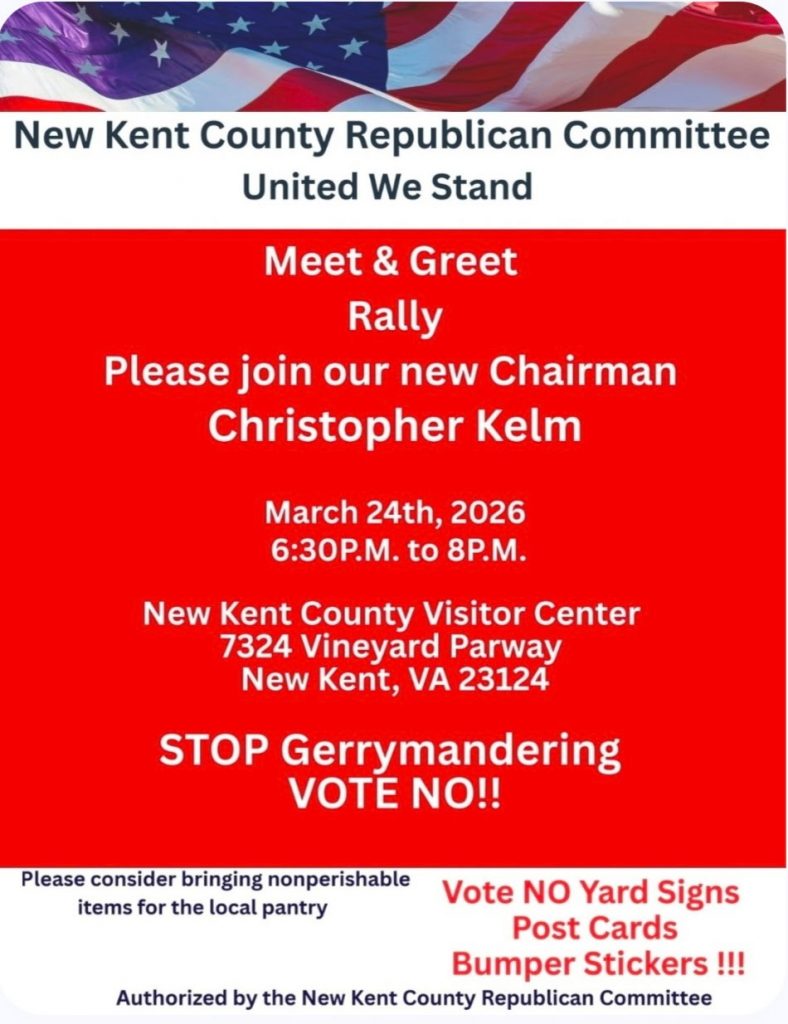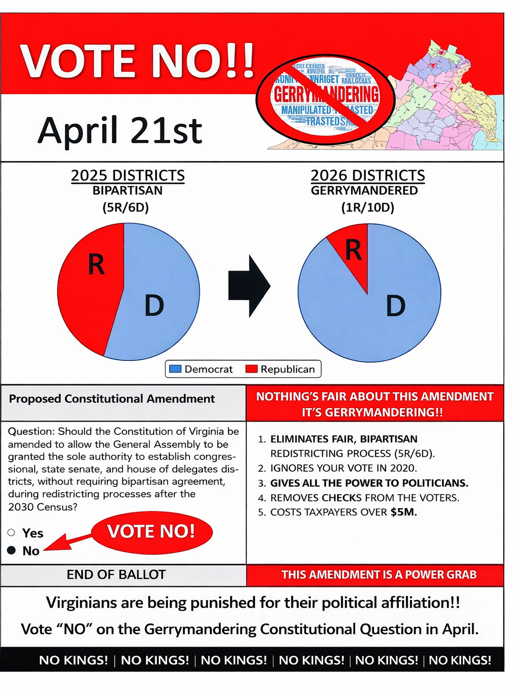 Our party urgently needs your help. We need to show up in force for the April 21st special election to ensure that we don’t lose our conservative “voice”. There is no second chance. If we fail, there will be no 1st District as we know it. The northern Virginia localities will outnumber the remaining 13 counties, thus eliminating our Republican representation for the foreseeable future. We must act now, and we need all hands on deck. Join the fight! VOTE NO. Vote now.